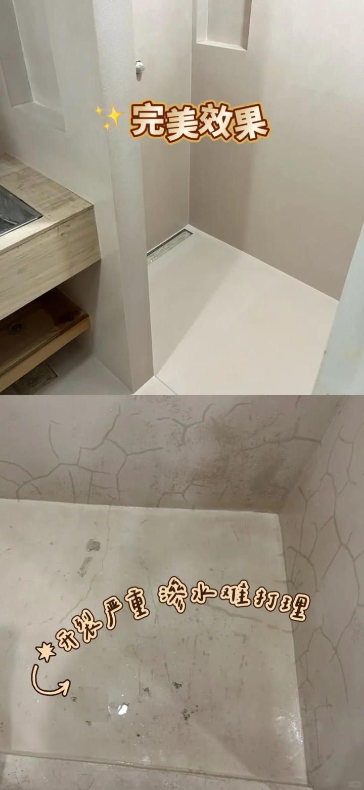 刚做好的微水泥卫生间,用久了的微水泥卫生间,这对比真的是触目惊心,真的是令人震撼。