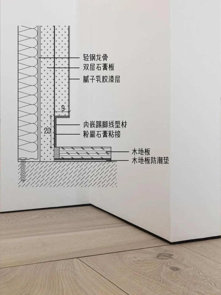 ——1、极简内嵌踢脚线有两种做法,一种是墙面双层石膏板校平,这种费用太高,我没有选择。一种是凿墙根内嵌,我用的这种,为此多花了一部分拆除费用。