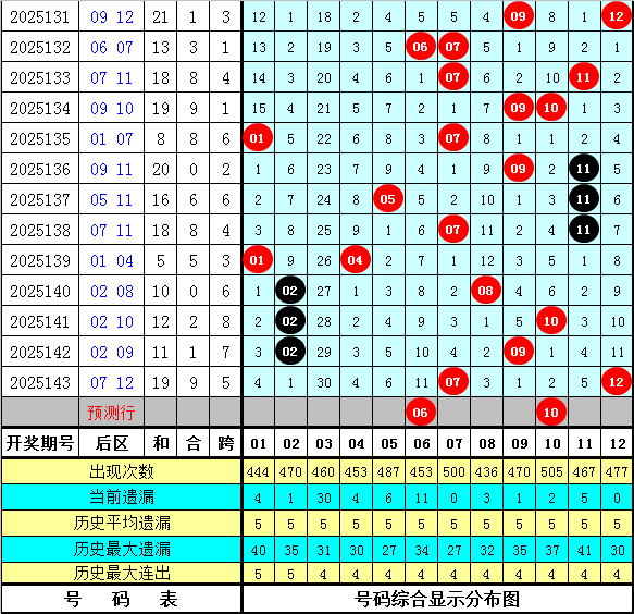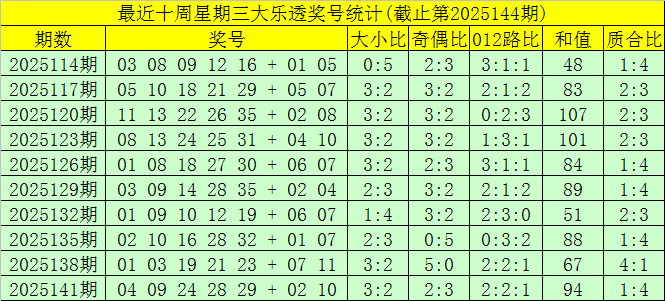 后区分析:最近10周星期三全小开出2次,一大一小开出7次,全大开出1次;一奇一偶开出2次,全奇开出4次,全偶开出4次,本期后区注意两码06+10。