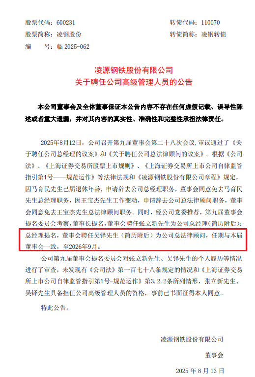 凌钢股份发布公告,2025年8月12日,公司召开第九届董事会第二十八次会议,审议通过了《关于聘任公司总经理的议案》和《关于聘任公司总法律顾问的议案》。