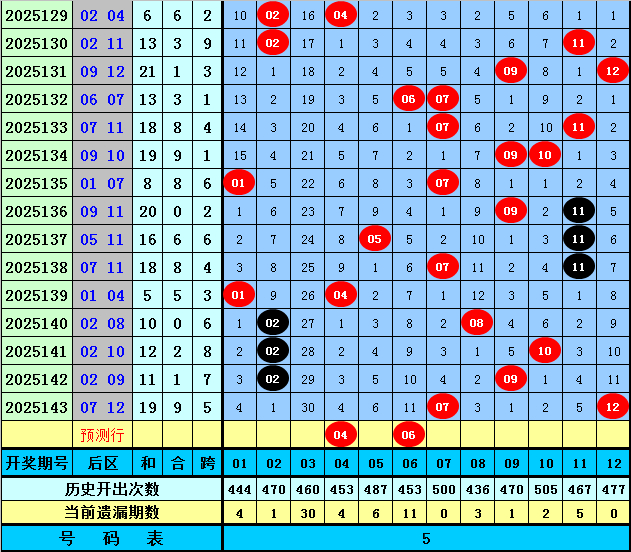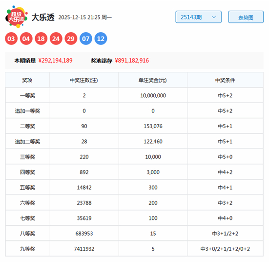 大乐透第2025143期开出奖号为:03、04、18、24、29+07、12。其中前区奇偶比为2:3,三区比为2:1:2,大小比为3:2,后区开出一奇一偶组合。